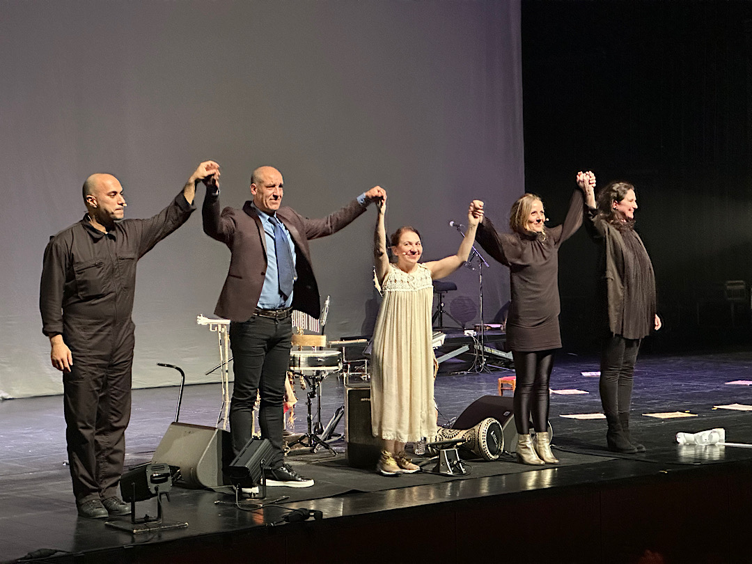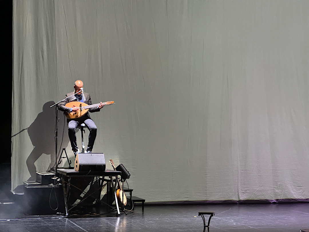 La comédienne raconte donc depuis sa petite enfance à Béjaïa, en insistant bien sur la particularité de son origine kabyle au-delà de l’Algérie, et on aura beaucoup d’illustrations de cette facette culturelle. Le spectacle est total dans ce qu’il offre en plus de la protagoniste unique, des projections très travaillées qui illustrent les décors qui sont évoqués, parfois des paysages, des motifs de tissus ou des bijoux. Et en plus de cela, quatre musiciens et musiciennes incroyables viennent compléter l’œuvre.