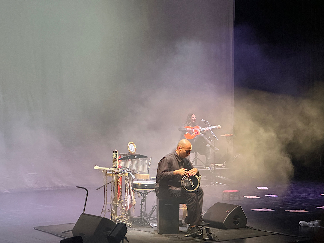 Raffaelle Rinaudo est à la harpe, et tout au fond masquée par les fumigènes, on reconnait Diterzi à la guitare. Cela illustre bien son humilité et la manière dont elle se positionne au sein du spectacle. Elle est une musicienne et chanteuse comme les autres, et elle se place vraiment en interprète du récit de Tassadite, probablement aussi en écho à ses propres origines paternelles kabyles.