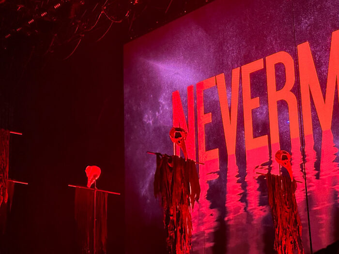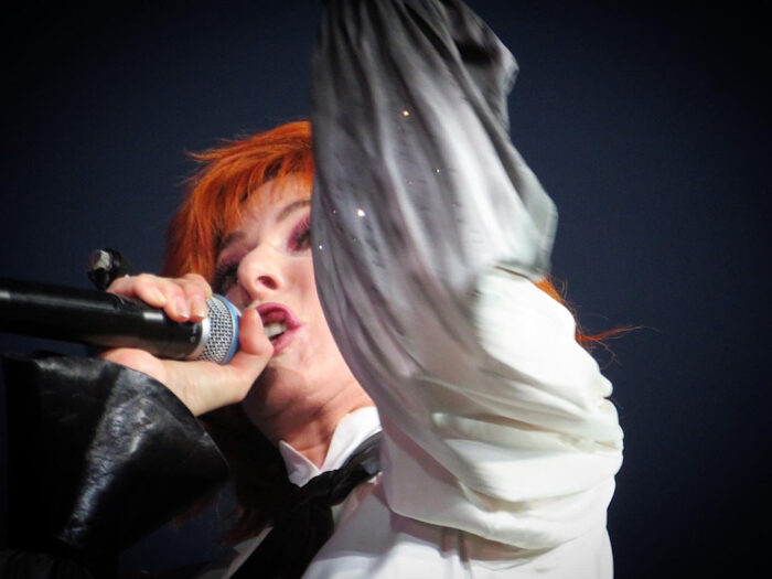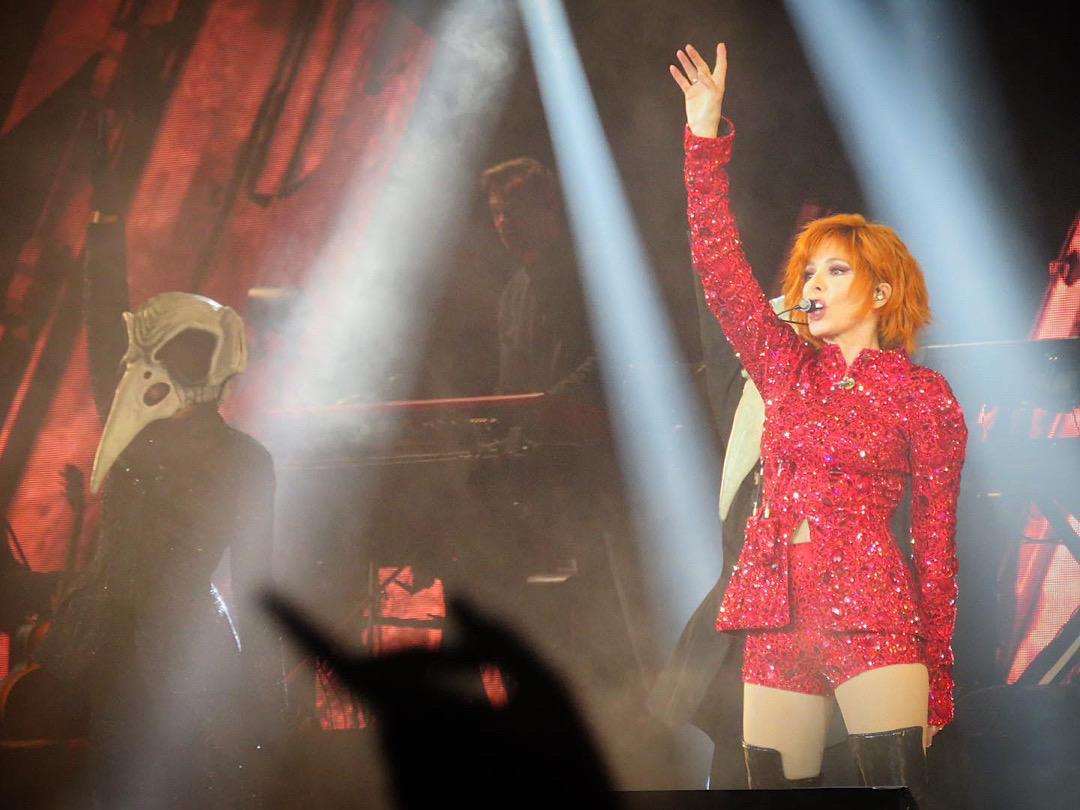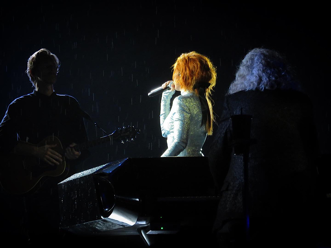 C’est forcément une redite (j’ai vu celui de Nantes) étant donné que les concerts de Mylène sont tout à fait millimétrés, mais on était placés légèrement différemment, et comme on a eu droit à de la flotte, ça a changé au moins les conditions atmosphériques. Huhuhu. La pluie a aussi sans doute compliqué un peu la logistique du concert, en rendant notamment l’avant-scène glissante (des personnes devaient passer la raclette avant chaque apparition à cet endroit), et on a eu surtout une immense hésitation au démarrage. Il y a notamment le morceau de Sigur Rós dont je me rappelle qu’il était très bien passé à Nantes, mais qui là a été diffusé au moins deux fois (ils ont dû même le remettre pour une moitié une troisième fois). Et donc le public a commencé à ironiser sur la chanson, à huer et à vraiment faire montre d’impatience.
