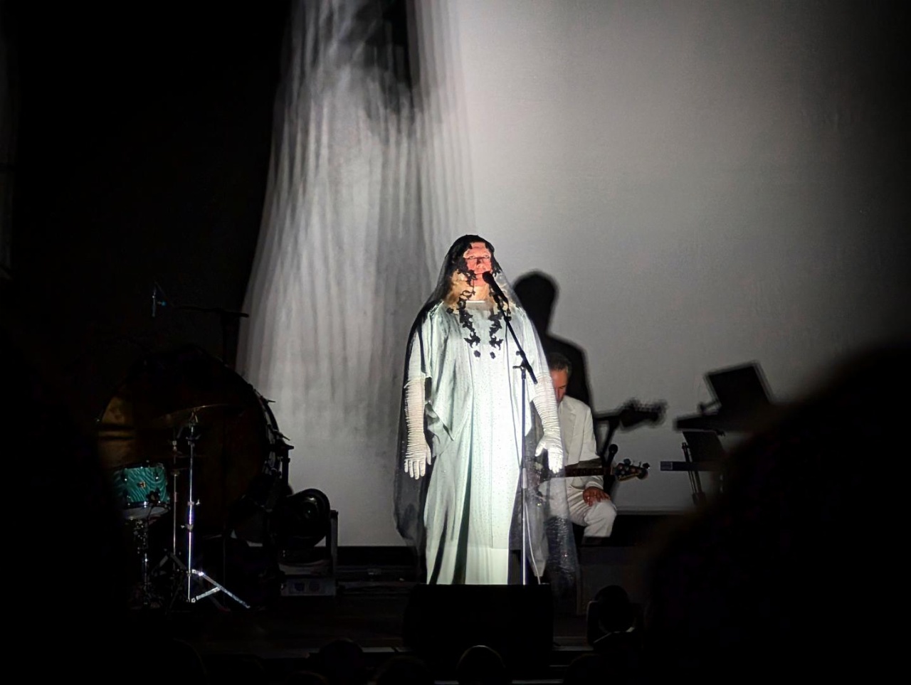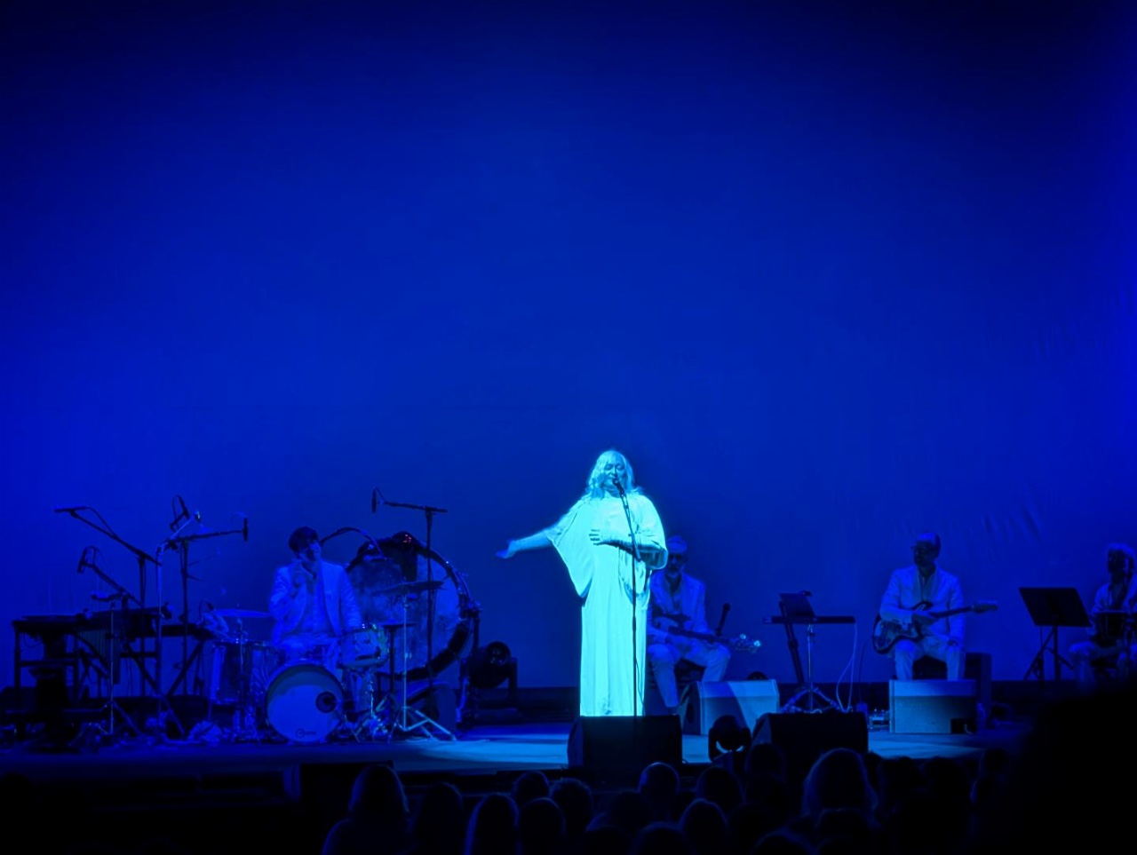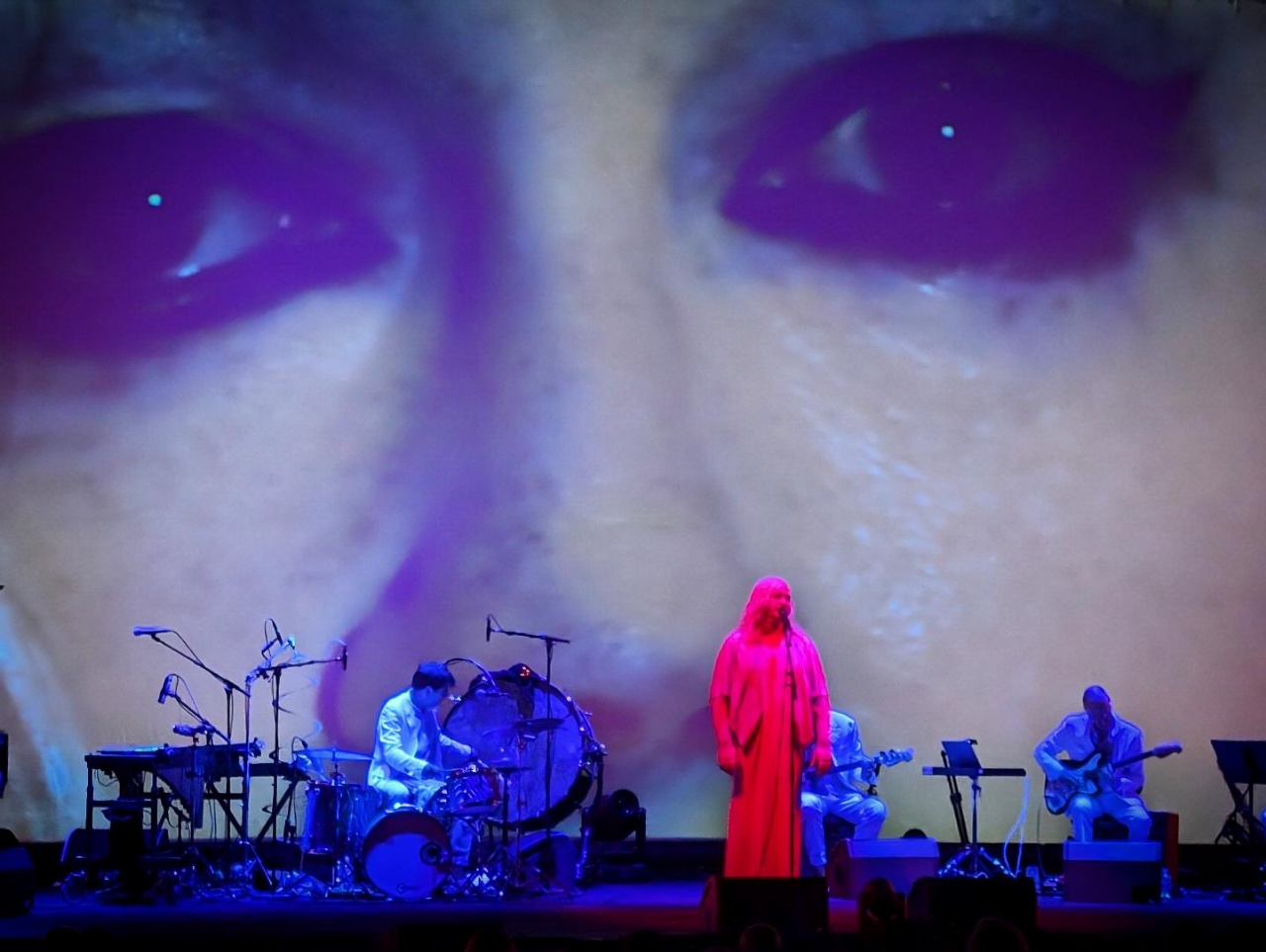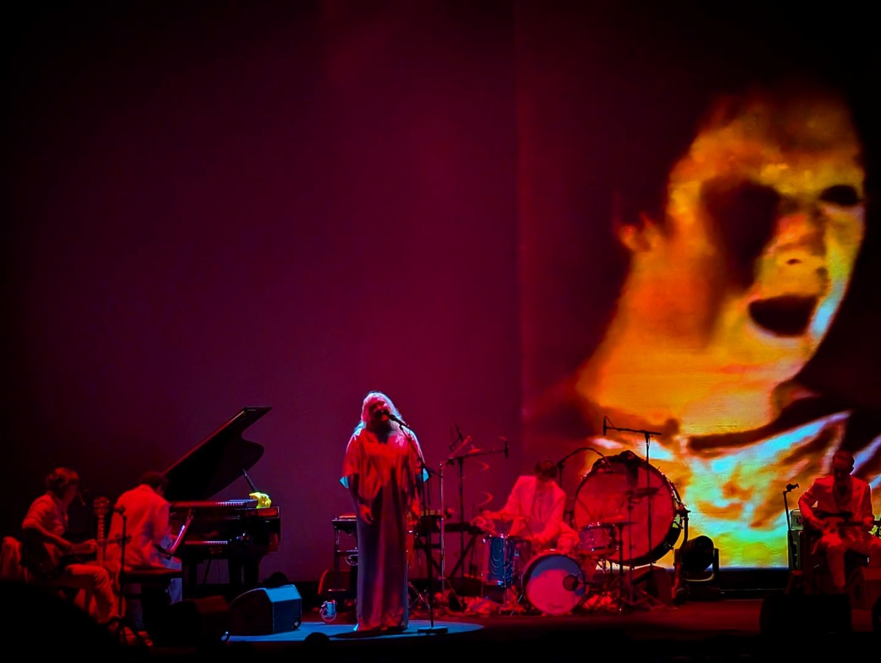 Formellement déjà, c’est une chanteuse d’exception, mais en plus les musiciens qui l’entourent sont ultra talentueux, et le son de la Philharmonie rend parfaitement hommage à leurs qualités. ANOHNI m’est apparue comme un étrange mix entre Lisa Gerrard et Björk. Les deux pour son allure de diva et la manière dont son aura occupe l’espace, dont sa stature et ses robes s’imposent à nous. Mais la première pour la voix qui nous habite dès les premières notes, et ne nous lâcheront jamais, aussi pour cette voix qui est son instrument et dont il joue pour nous toucher par ses modulations, son vibrato et l’ensemble de ses prouesses vocales. La seconde pour une créativité sans relâche, une droiture dans son art, pour le goût de la démesure et d’une singularité qui nous ont amené jusqu’ici, avec la surprise qu’elle a elle-même exprimé d’avoir eu du succès.