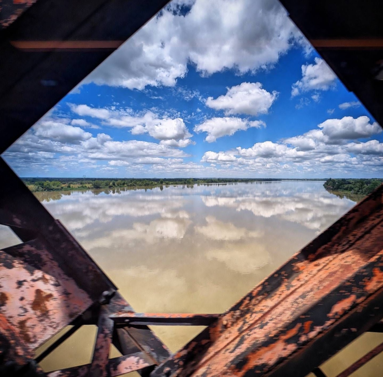 Nous sommes retournés à Nantes juste à temps pour aller voter. Et j’ai été impressionné par la traversée des deux fleuves, d’abord Garonne puis Dordogne, avant même l’imposante Charente. En passant un pont ferroviaire, j’ai pris quelques photos au hasard à travers des croisillons rouillés, et celle-ci m’a bien tapé dans l’œil, pour son cadrage à l’esthétique stochastique mais bien effective.