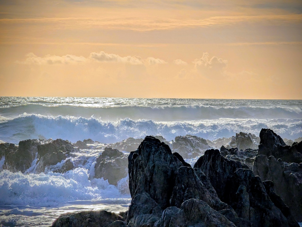 Cette plage est très sympa pour tous ces rochers qui affleurent du sable, et ce sable est assez grossier. Les rochers sont donc usés et polis par la belle machine à laver et l’effet « émeri » du sable. Cela produit un profil très spécial avec des tas de creux et de bosses mais pas du tout abrupte (on peut vraiment y marcher pieds nus, mais ça glisse !). A ce moment de la marée, c’est idéal car les rochers sont recouverts par les vagues, mais pas complètement par la hauteur d’eau, et donc avec un soleil rasant on obtient de jolis effets de perspective.