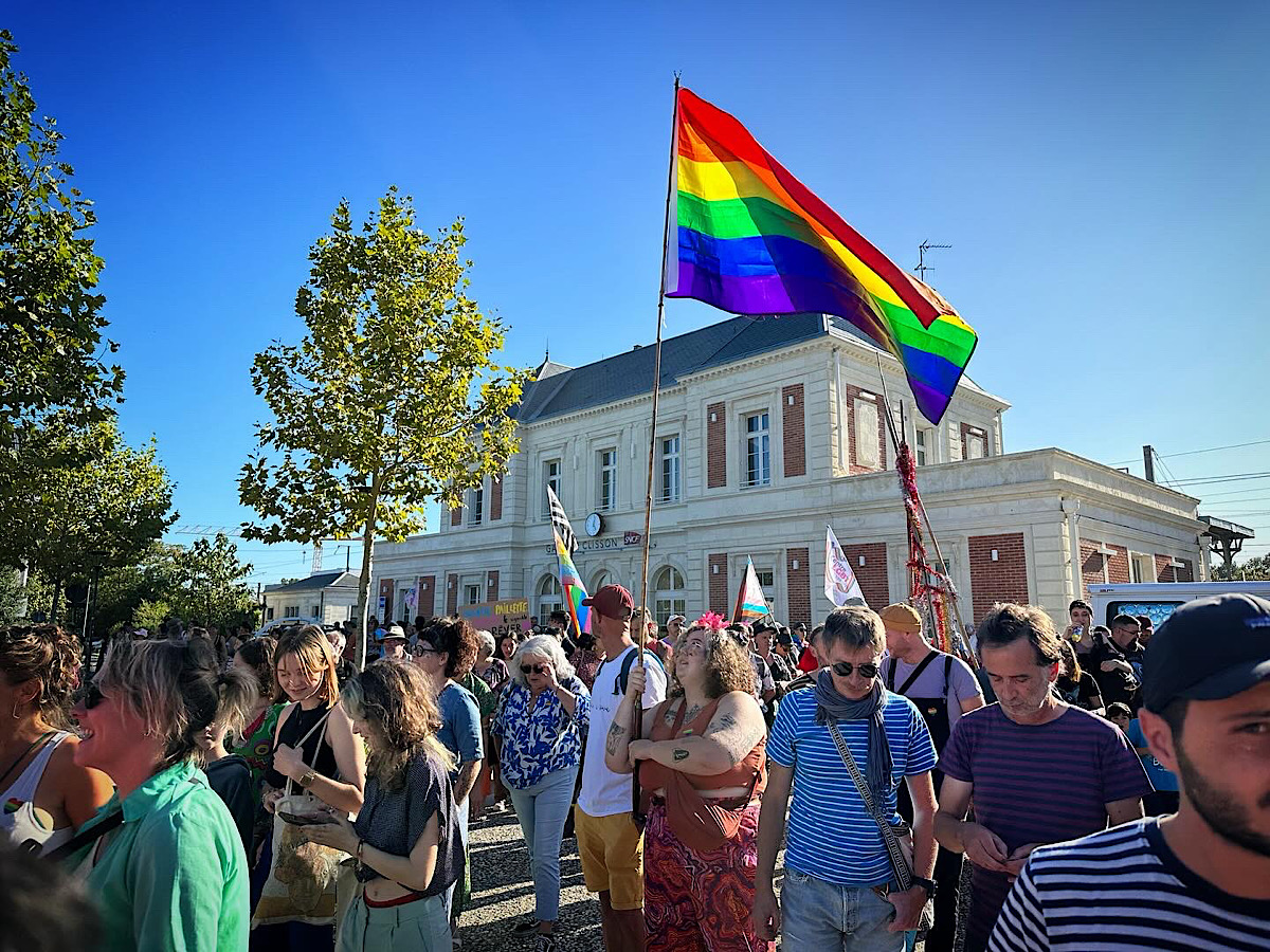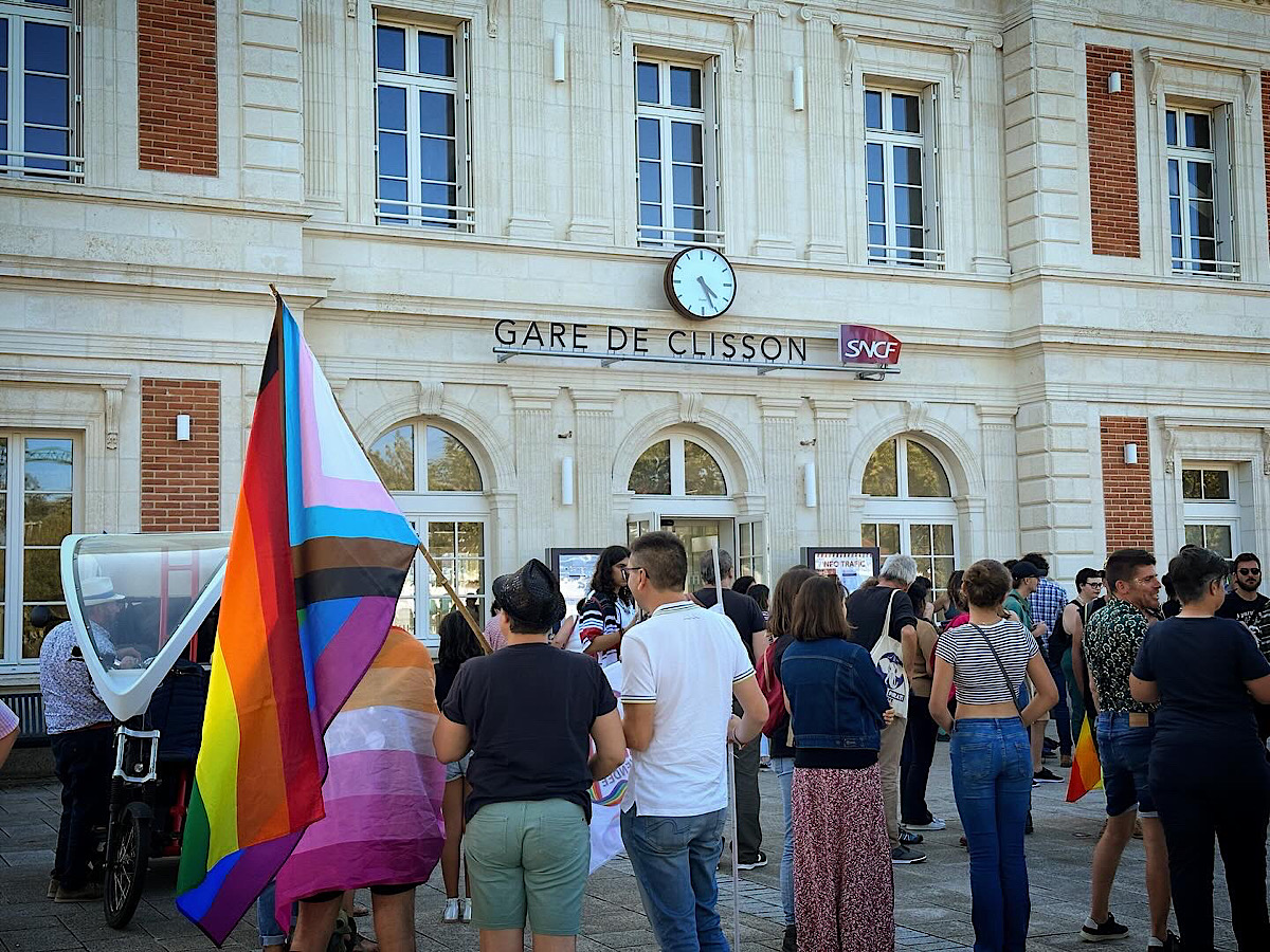 Le rassemblement s’est fait à 16h30 devant la gare SNCF de Clisson, et on a vu peu à peu des drapeaux LGBT divers et variés converger sur le parvis. Finalement, il me semble que ce sont près de 200 personnes qui se sont ainsi retrouvées pour cette première marche des fiertés.