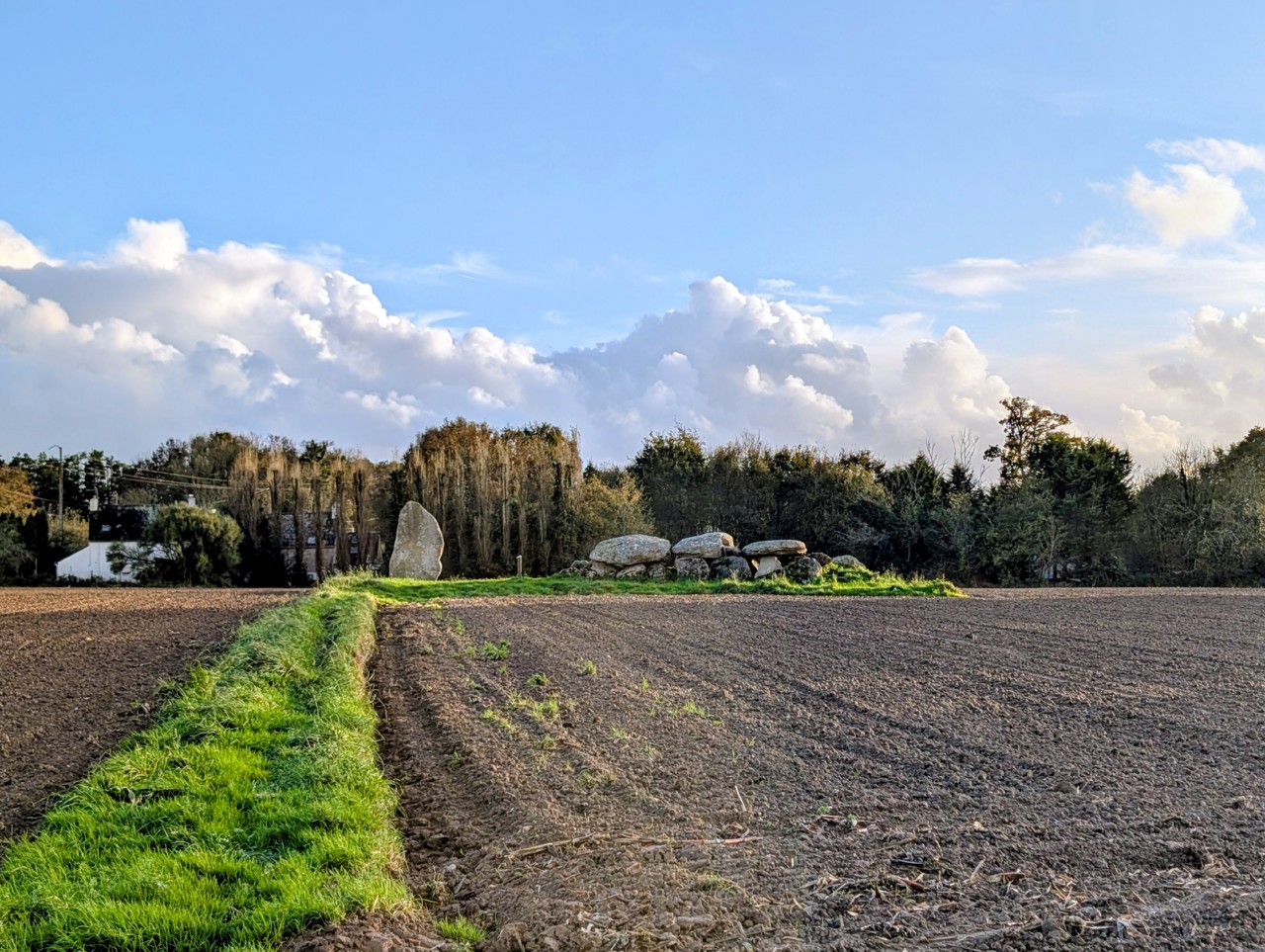 Il s’agit donc d’une allée couverte précédée d’un menhir qui est juste dans l’alignement. Mais l’originalité c’est leur emplacement, puisqu’ils sont en plein milieu d’un champ cultivé, et il y a juste un mince chemin pour s’y rendre.