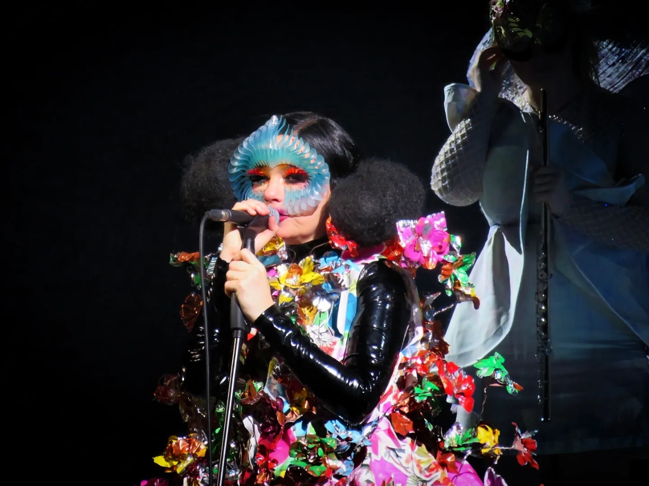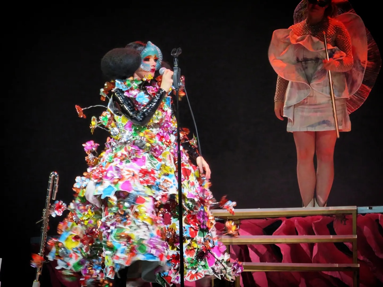 Le concert revêt également une mise en scène très différente des autres spectacles, parce que l’on est un peu plus dans un cadre formel avec l’orchestre, et la chanteuse embrasse totalement ce nouveau concept. On la retrouve donc avec cette coiffure semi-antique full drag queen et une tunique blanche ample, comme une immense surchemise qui flotte autour d’elle (qu’elle abandonne ensuite au profit d’une petite robe noire en dessous). Elle est dans ce rôle d’allégorie vivante de la musique, mais est-ce Calliope, Érato, Melpomène, ou un peu d’Euterpe et de Terpsichore ? On l’ignore, mais on adore ! ^^